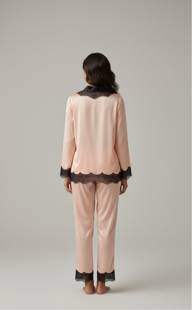 Unwind in elegance with this luxurious satin loungewear set, crafted in a stunning blend of soft peach and bold black. The smooth satin fabric drapes beautifully, offering a silky touch against your skin while keeping you effortlessly stylish. Perfect for cozy evenings at home or elevated lounge looks, this set brings together comfort and sophistication in one timeless design.