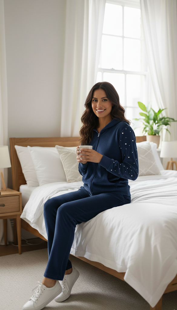 The jacket features a sleek zip-up front, ribbed cuffs, and a tailored fit that flatters every silhouette, while the matching joggers offer an elastic waistband and a relaxed yet refined drape for all-day ease. Whether you’re lounging at home, traveling in style, or stepping out for a casual outing, this tracksuit exudes effortless glamour.